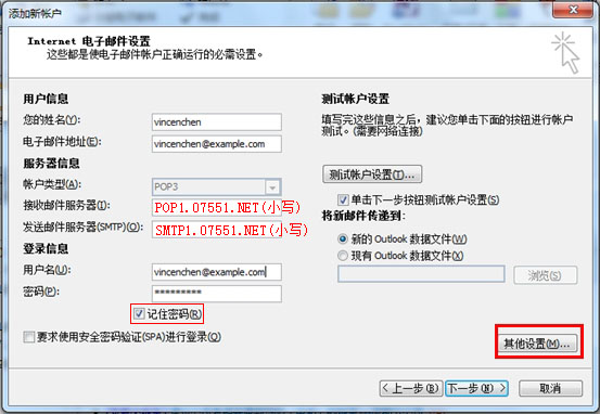 其中,接收郵件服務器是pop1.07551.net和發(fā)送郵件服務器smtp1.07551.net。填寫完后,點擊“其他設置”。